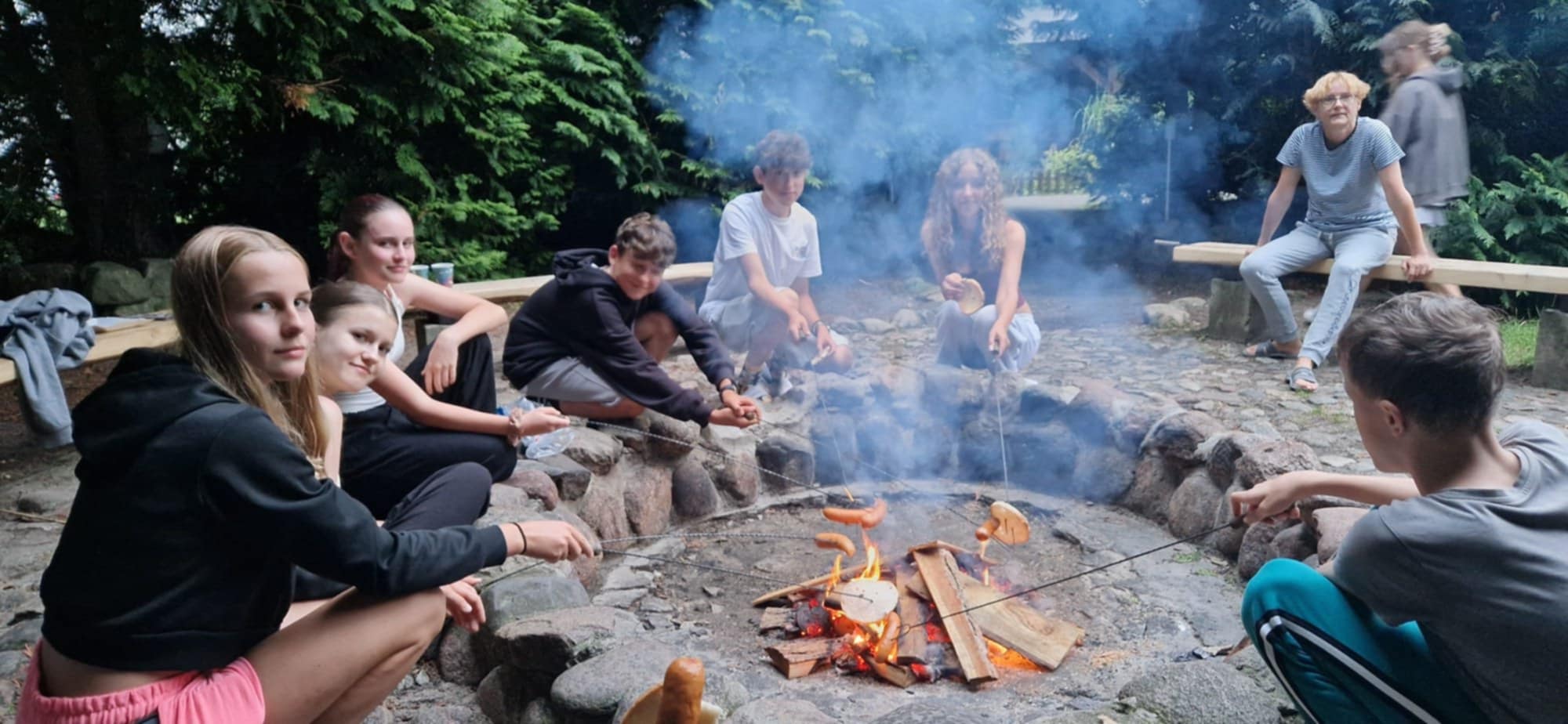 - ognisko z pieczeniem kiełbasek i zabawą w gry słowne np. trzy historie, kim jestem, szubienica, kalambury